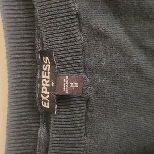 dark green sweater. 3/4 length sleeves. high/low rounded bottom hem. express size medium.