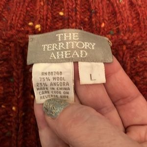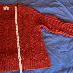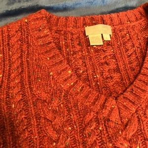 This is an oversized wool sweater, V neck with elbow patches. The main color is rust with several flecks of color so several different colored shirts can look nice underneath.