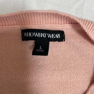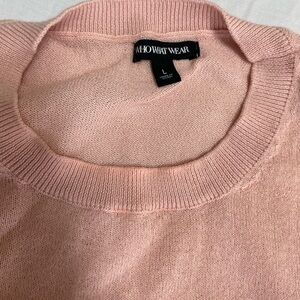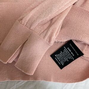 Pale pink sweater with split sleeve detail. Slight discoloration at neck