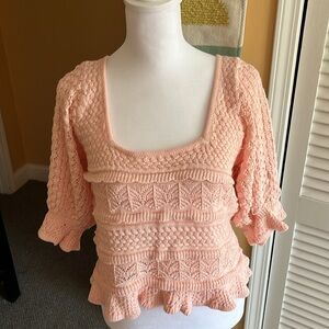 Pink soft shorter sleeved sweater from Bibi. NWT. Just tried on. Square neck line.