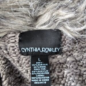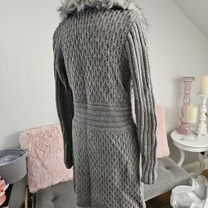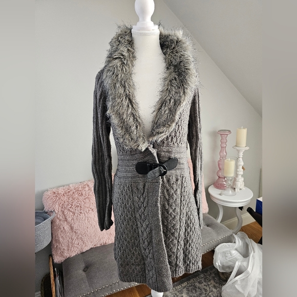 Coat-sweater with faux-fur collar, snap and buckle closure.