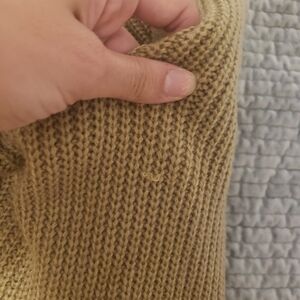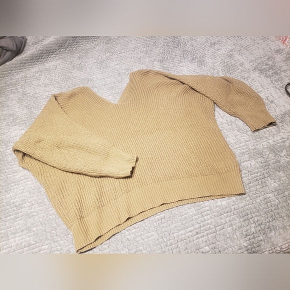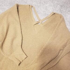 tan sweater with criss cross back. worn a couple times, slightly oversized. noticed a little snag pictured last