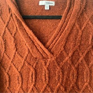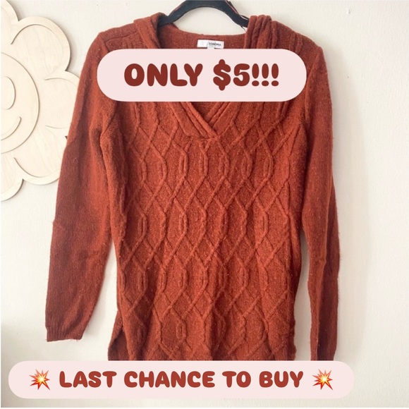 Burnt orange, v-neck, hooded sweater. Good condition.