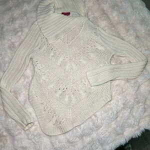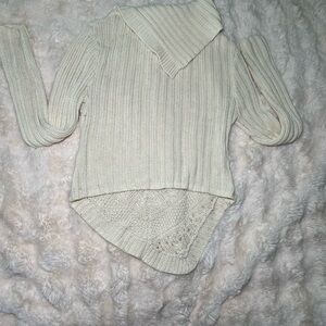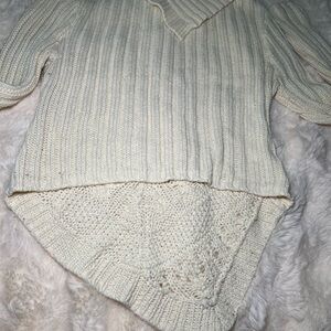 Cream colored sweater sits at waist in back then dips to a point in front