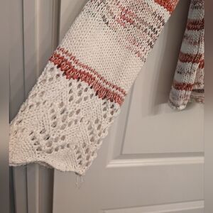 Red, beige and brown striped bell sleeved sweater. Great for the the spring. The weave in the fabric allows for the any spring time breeze to cool you down. Large.