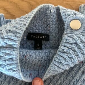 Talbots beautiful blue with color flex’s, textured stitch cable knit. Mock neck with silver buttons on one side. Like new condition.