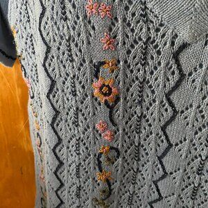 This is a blue flowered sweater with an insert which gives it a layered look, V-neck by Maurano in size lg. Never been worn.