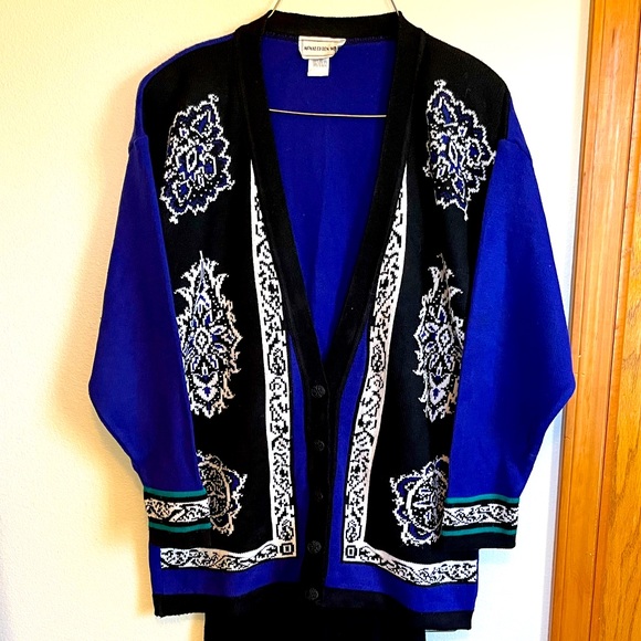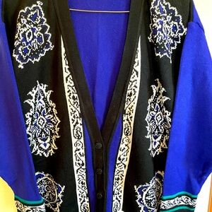 Beautiful sweater cardigan. Would go beautifully with a pair of dress pants or a black skirt. Size S.
