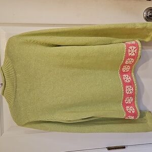 embroidered semi turtleneck, long sleeve. snowflake design with small beads on front. like new condition. handmade look snowflakes and trim edging.