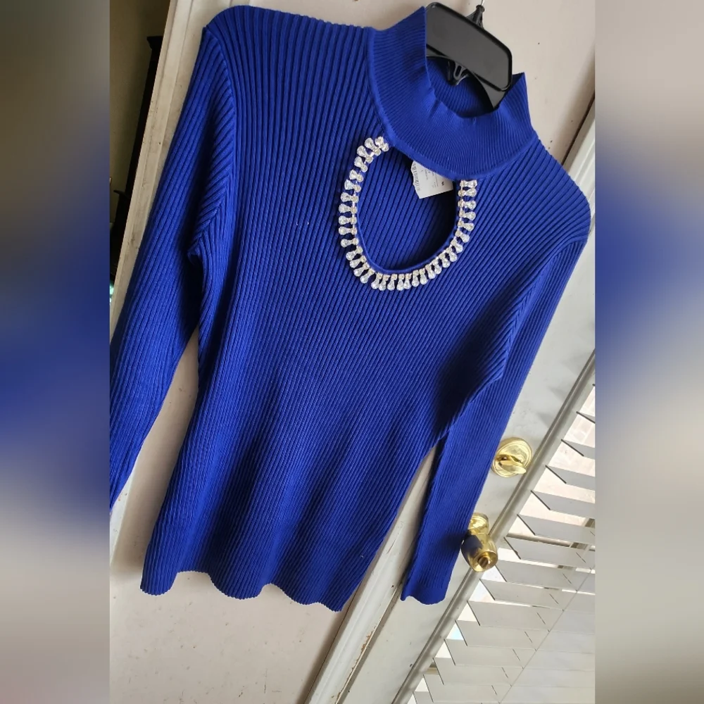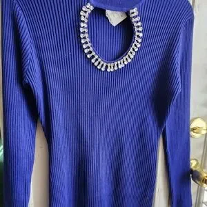 This royal blue, long-sleeved sweater features rhinestones embellishing a chest opening, offering a stylish and alluring option for casual or evening wear.