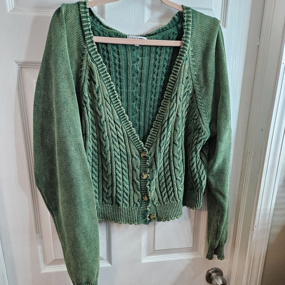 Vibrant green cable knit cropped Vneck cardigan sweater