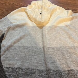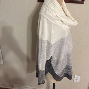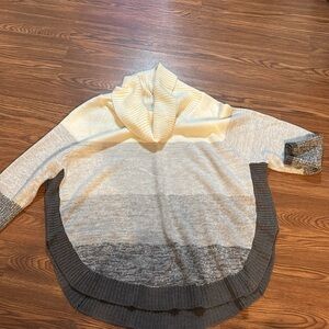 Cowl neck sweater is oversized long sleeve with a curved hemline. Grey and cream color block. In great condition.
