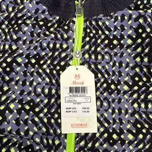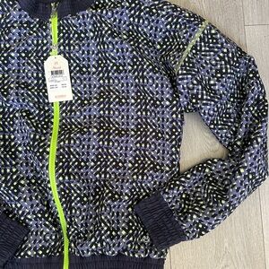 Chic puffer jacket with navy and lime pattern. Lightweight and cozy. Ideal for cool weather.