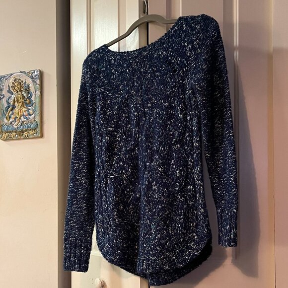 Beautiful blue yarn with a touch of white and aqua and some little bits of sparkle. Petite Medium but long. Acrilic/Nylon/Linen.