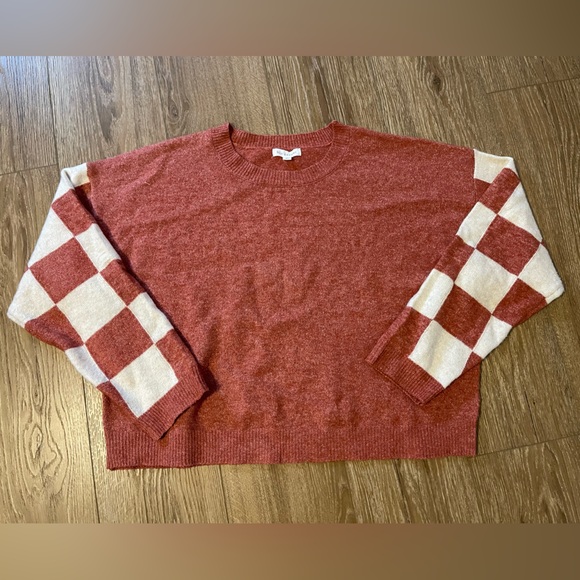 Stylish orange sweater with white checkered sleeves. Perfect for casual wear.