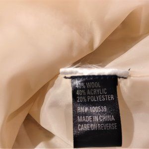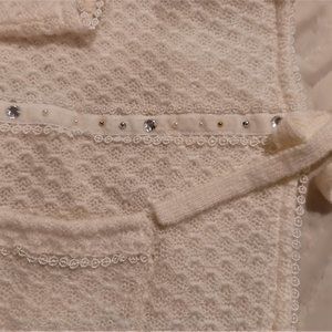 Sweater Blazer in creamy white/ivory. Taffeta lining. Sleeves, bottom, collar trimmed in dainty lace. Light bling around the waist with a sweater tie. Size 8/10 or M. 40% wool.
