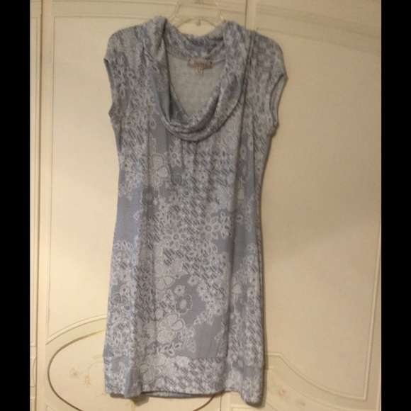 Grey and white lacy/floral print sweater dress with cowl neck detail. Super lightweight, soft and comfortable sweater material. In great condition, gently worn. No rips, tears, runs or stains. Looks amazing with leggings/tights and boots...perfect for fall!