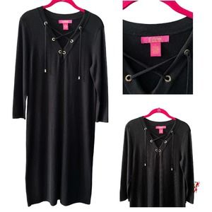 Sweater Dress Black Classy Gold Lace Up Tie front Upscale Catherine Malandrino