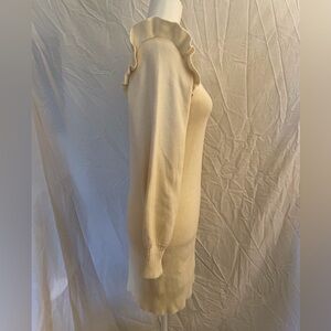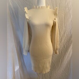 Never worn. Super cute cream colored sweater dress. Will totally transport you to the ‘80’s. Made from a luxurious blend, the dress is crafted from soft, skin-friendly, and stretchy knit fabric with vertical ribbed texturing. Perfect for staying cozy, and comfortable at every event. Features a chic mock neckline, long puff sleeves with ruffle shoulders and fitted cuffs, and a flattering bodycon silhouette that ends in a mid-thigh length hemline. Stay stylish and warm all season long in this adorable retro looking sweater dress.