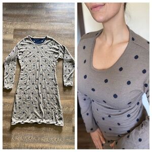 Soft reversible crewneck sweater dress. One side is taupe/brown with navy Polkadot sand the reverse size is navy blue with taupe/brown dots. Pair with boots or booties for an effortlessly chic yet comfy vibe. Fabric is soft to the touch. Note: there are no tags in this dress but it is a size large. Please see photo section for approximate flat measurements, my model stats for fit reference + fuzzy appearance of fabric {normal wear from use}.