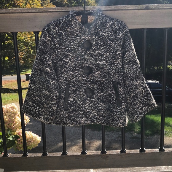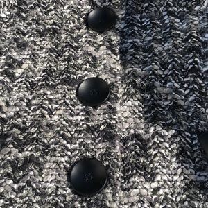 Petite sweater jacket. Big buttons. Front pockets. Loose arms.