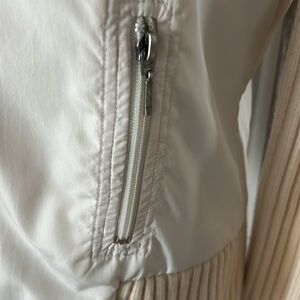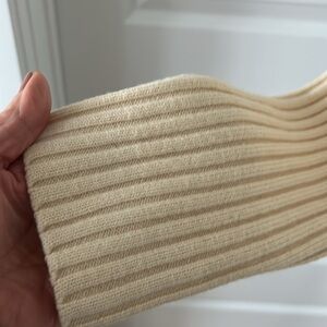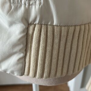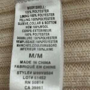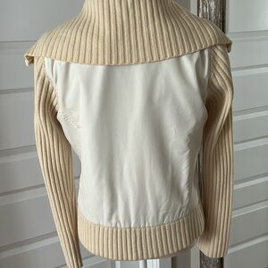 Cream & Tan Sweater Jacket with Fleece lining. Size M. Wide ribbed collar. Ribbed sleeves. Ribbed waistband. Body is fleeced lined. Full front zipper. 2 working pockets. Designer tag removed. She has wool in her but she’s not itchy. She’s probably a vintage piece. She’s a Reposh. I wore her with white jeans for that sophisticated tonal look. She’s in excellent pre loved condition. No yellowing or stains. Recently dry cleaned. Note: once I decide to sell something, I put in storage. So she’s ready to be shipped and worn immediately.