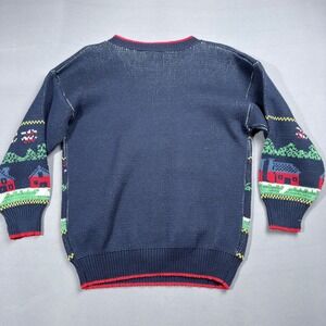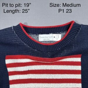 Vintage patriotic sweater featuring American flag design. Navy blue base with red trim and decorative hearts. Classic crew neck, long sleeves, ribbed cuffs and hem. Festive knit pattern includes 'AMERICA FOREVER' text. Made by Sweater Loft New York. In good vintage condition with no major flaws. Pit to pit - 18" Length - 25" ***Missing Star Patch Style: Pullover Color: Blue Department: Unisex Adults Type: Sweater Material: Cotton Blend Neckline: Crew Neck Sleeve Length: Long Sleeve Pattern: Fair Isle Features: American Flag Design, Train Motif, Heart Appliques, Ribbed Trim, Crew Neck Sleeve Type: Raglan Sleeve Fabric Type: Knit Accents: Embroidered Keywords: americana, patriotic sweater, american flag, train motif, vintage knit, holiday sweater, novelty sweater, hearts, america forever, navy blue, retro, made in usa