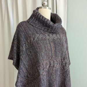 Turtleneck cable knit poncho / cape pullover sweater from Cracker Barrel, size one size. Marled knit in red, blue and gray for a purple effect from a distance. Ideal for boho, western, bohemian, casual, and relaxed vibes. Perfect for fall, winter, layering, travel, and office.