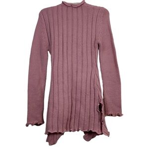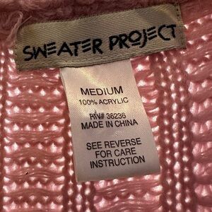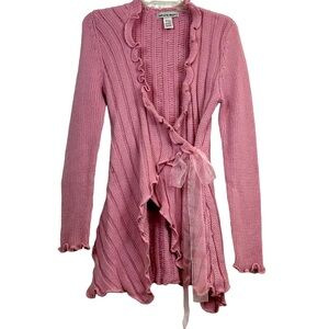Sweater Project pink wrap cardigan, women’s size Medium. Features soft knit fabric, ruffle trim, wrap style with sheer organza ribbon ties, and feminine cottagecore-inspired design. Lightweight and versatile, perfect for layering over dresses or tanks. Excellent condition.
