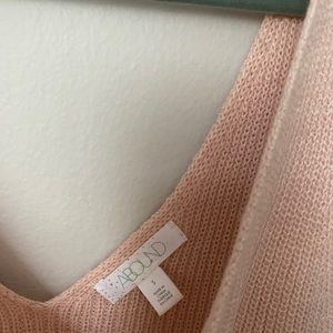 Pale pink ruffled tank, light sweater material. Flattering and light weight.