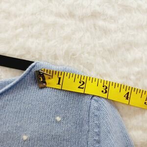 This Benedetta B powder blue sweater brings soft, whimsical charm to your wardrobe. Crafted from a luxurious blend of merino wool, cashmere, viscose, and nylon, it features delicate white embroidered dots across a tight knit design. Lightweight yet cozy, it's perfect for layering or wearing solo for that dreamy, cottage-inspired look. A true blend of quality and comfort.Styling Suggestions