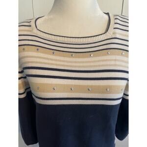 Women's 3/4 sleeve pullover sweater. It has a crew neckline. It is a navy blue sweater with tan and white stripes across chest. Bottom hemline is a blue and white strip. Silver-tone stars across the chest. Brand tag has been removed but measures to a size medium. I believe it is cotton and should be hand-washed.