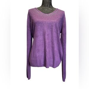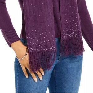 Coordinated sweater set featuring a sleeveless knit tank top, a long sleeve sweater, and a matching scarf. The set is a beautiful shade of purple and is embellished with sparkling rhinestones. The scarf features a fringed hem, adding a touch of texture and movement to the ensemble.