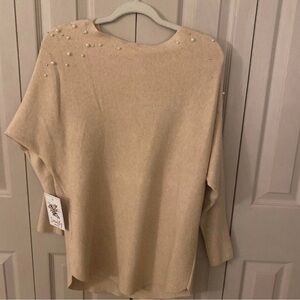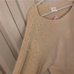 Adorable blush colored sweater with rhinestone and pearl embellishments. This is a fitted top with batwing sleeves and a slouchy neckline.