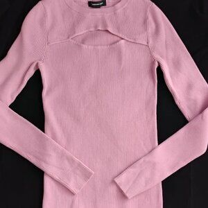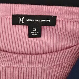 Mauve Sweater LIKE NEW COND. Peek-a-boo front cut out. Soft, comfy, flattering bodycon. Ribbed, stretchy [knit-like] fabric. INC brand, Size XS. Front cut out allows for regular style bra without bra straps showing. 75%Rayon25%Nylon, Hand Wash. Worn once. True color is soft rosy mauve.
