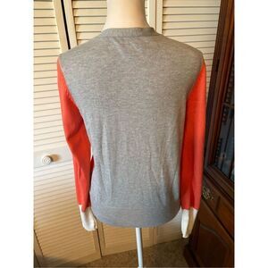 Sweater, Worthington Womens Color Block Cardigan Sweater, size Small, Orange Gray and White. This little cardigan is super cute with fun details. The shoulder seam is dropped slightly toward the front, showing the gray from the back at the top of the shoulders, then a big block of orange, with white at the hem and cuffs. Check out the picture of the cuffs with a decorative row of 4 buttons on each sleeve. Fabric content: 53% cotton, 40% rayon, 7% nylon. Easy care: Machine wash gentle / dry. Pit to pit: 18”. Sleeve length from shoulder seam to cuff: 24”. Total length from back center neck edge to hem: 22”. Good condition.