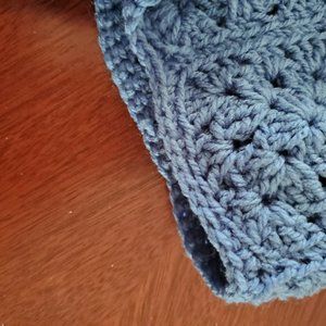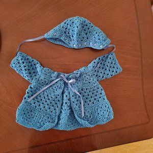 This is a sweet handmade crochet baby sweater jacket and hat set with ribbon accents. True color is Cobalt Blue which the picture does not show well. Size is unknown due to this was a handmade gift. NEVER USED