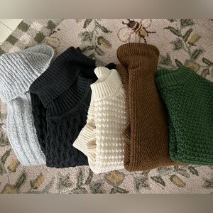 These ADORABLE sweaters are so comfortable and cozy. All sweaters have been worn a couple of times. Green and cream sweaters are Universal Thread. Charcoal grey cowl neck sweater is American Eagle. Brown sweater is the brand Double Zero. All sweaters fit like a small / medium. So much life left in them - just rotating them out for the summer season! ๐ฟ