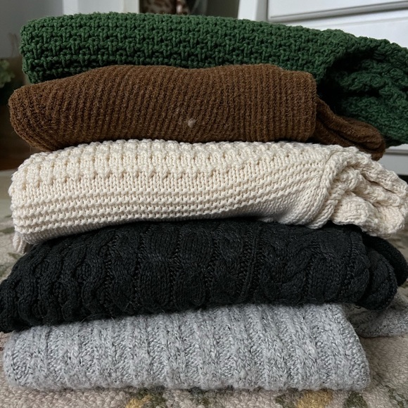 These ADORABLE sweaters are so comfortable and cozy. All sweaters have been worn a couple of times. Green and cream sweaters are Universal Thread. Charcoal grey cowl neck sweater is American Eagle. Brown sweater is the brand Double Zero. All sweaters fit like a small / medium. So much life left in them - just rotating them out for the summer season! ๐ŸŒฟ