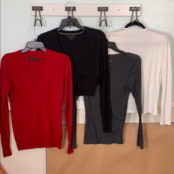 Make me an offer! All gently worn or never worn light sweaters. Red vneck (that’s not too low), black crop button down sweater with long sleeves, charcoal crew neck long sleeve and one white poly/cotton crew neck with open twist back.