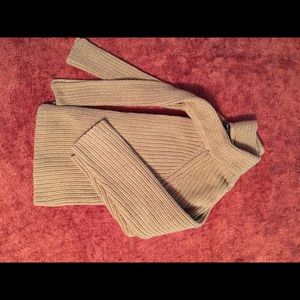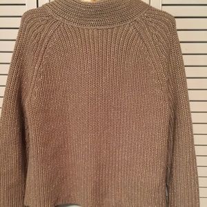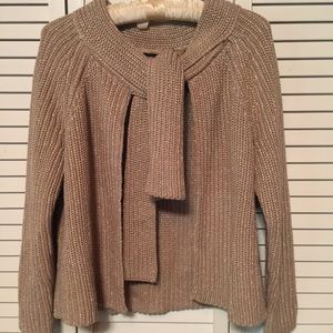 Cotton, acrylic and polyester blend with gold metallic highlights. Shawl collar. Raglan sleeve. No buttons or enclosures. Hangs open.