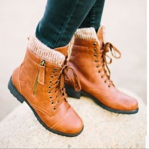 Brown combat lace up boots with sweater top. Zipper is not functional. 1/2 inch chunky heel.