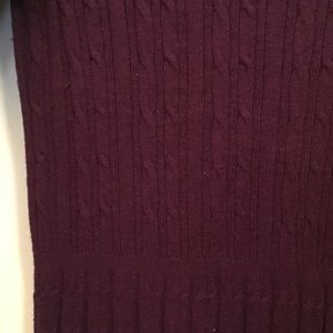 Purple, cable knit sweater dress. 3/4" sleeves, knee length. Very versatile. Can dress up with scarves, jewelry, belts, boots, hats... very warm too.