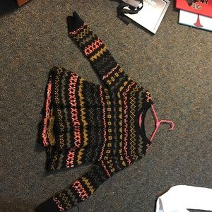 This sweater is very cozy and would be really warm in the winter. It is a perfect sweater for nights out or even just to lounge around! It is black with warm colors!