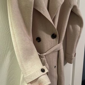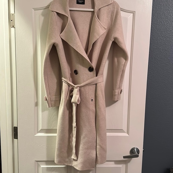 Long coat with sweater like material. Removable tie. Like new.
