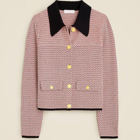 Knit in a herringbone pattern from multicolored yarn with a ribbed collar and gold crest buttons down the front. In perfect condition. Size M but would say it fits better as a S.