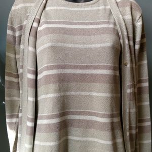Two pieces set. Metallized yard with cotton,acrylic, polyester 5 percent metal. Three color combo, silver, white lite lite green and lite tan. Silver metal tread throughout. Design by Imagio Very classy and in excellent condition.