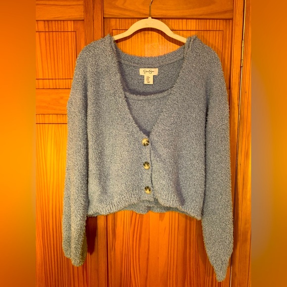 •Light blue sweater set: teddy bear material cropped cardigan with matching cropped tank top