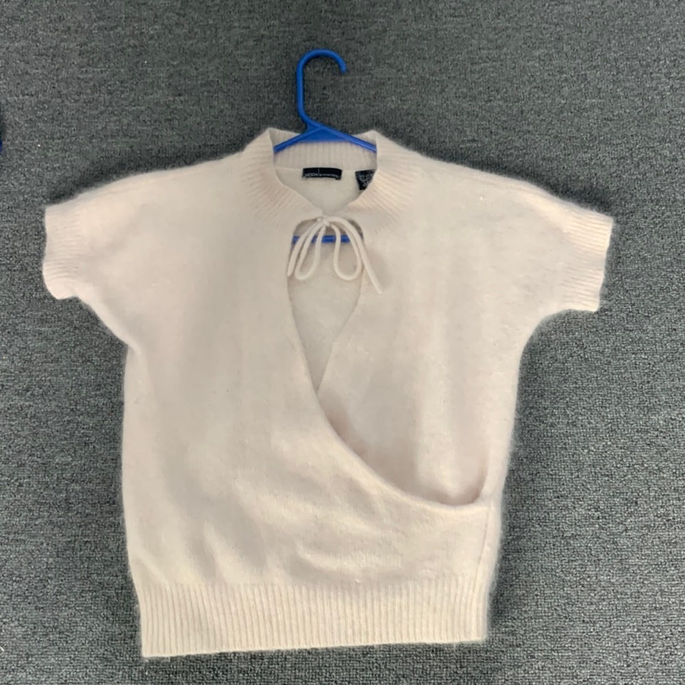 I got this from a thrift store in LA awhile back. I never know what to wear under it that looks right. So it’s better off with someone else that’ll give it a chance. There’s nothing wrong with it. It’s a fuzzy short sleeve sweater, the chest is open and it ties at the neck. I love it, just don’t know how to style it. It’s a light pink btw!