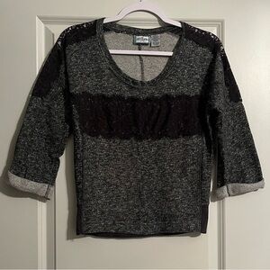 Cute 3/4 sleeve, grey sweater with lace accents across the front and shoulders.